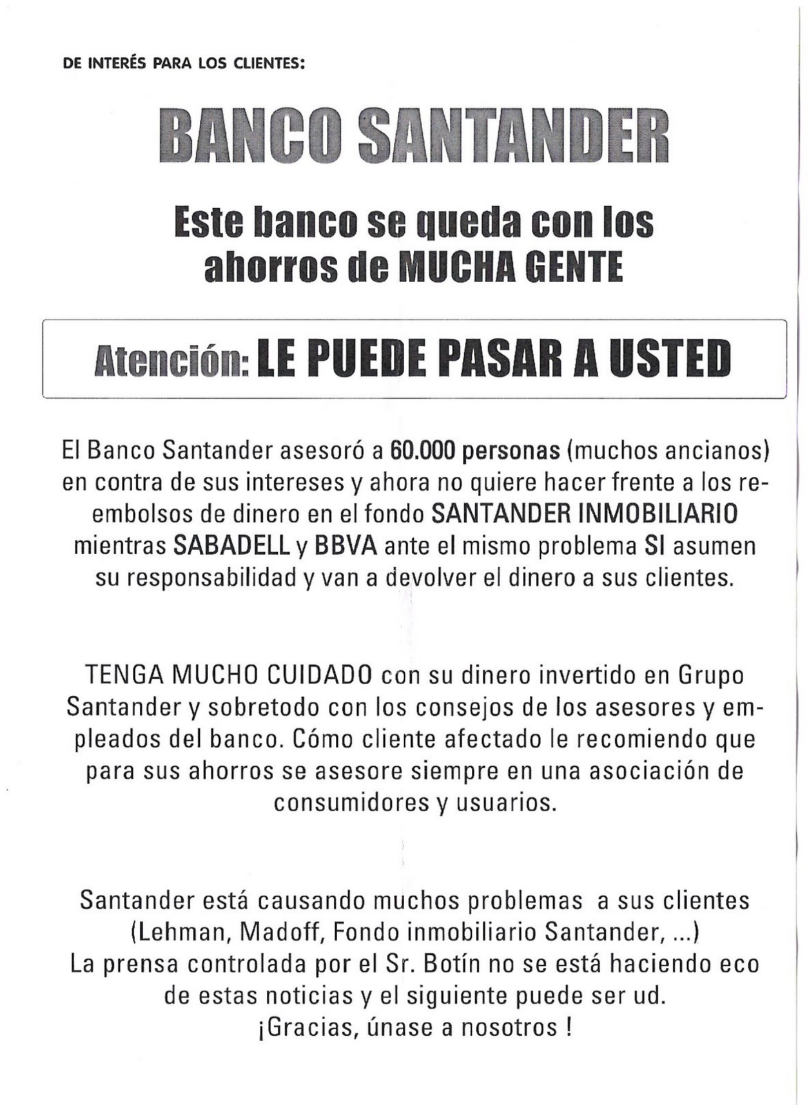 En la mañana de este sábado un pequeño grupo de manifestantes protestaba en Madrid contra el Banco Santander del señor Botín por engaños en el fondo Santander Inmobiliario. Se quejaban de la falta de difusión mediática de su problema. Reproduzco la información.