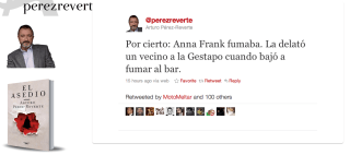 Perez Reverte trae a colación a Anne Frank y a la gestapo en su twitter. Nos revela un hecho hasta ahora desconocido sobre la delación de la niña alemana. Fue un vecino y todo por un fatídico cigarro «cuando bajó a fumar al bar» :-)))