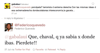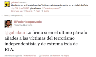 Después de leer y de hacer una crítica del artículo escrito por @Federicoquevedo, periodista de la derecha que se autodenomina liberal, que suena mejor, en relación al atentado terrorista en Noruega, escribí un tuit con copia al periodista e intercambiamos unos pocos tuits que finalizaron, por su parte, con este: