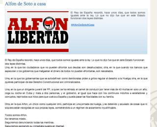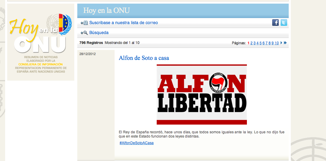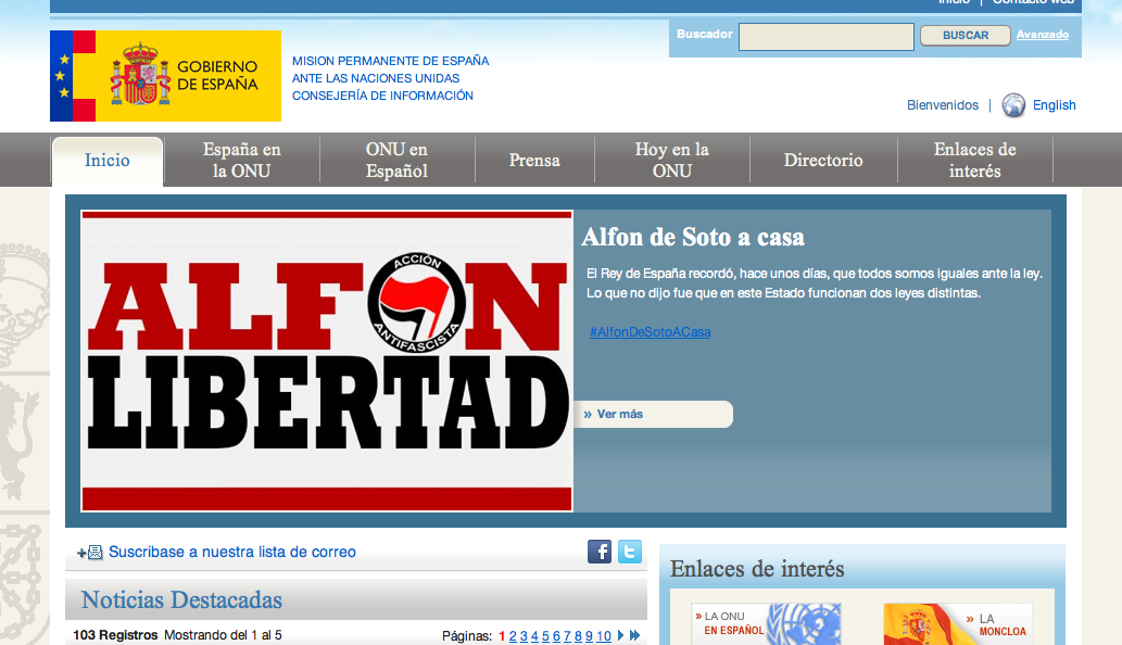 La página de la misión permanente ante las Naciones Unidas del gobierno de España ha sido hackeada para denunciar y exigir la libertad de Alfon, detenido durante la huelga general del 14N al que se le ha impuesto el régimen de aislamiento FIES-5 en una decisión judicial y una actuación policial indigna de un estado de derecho. En varias ciudades españoles se han manifestado miles de personas exigiendo su libertad: Concentraciones en apoyo a Alfon.