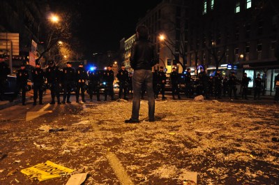 Pues los hechos nos dicen que no es necesario. La UIP ha realizado movimientos entre los manifestantes que ha desembocado en cargas sin que se hayan producido acciones violentas por parte de estos. En otras ocasiones, las formaciones tácticas que adopta la UIP y que permiten anticipar una carga es respondida por una mínima reacción (lanzamiento de una botella o gritos de estas son nuestras armas, mientras se levantan las manos, cruzadas con un hijos de puta) para desencadenar una respuesta violenta desproporcionada. Aún así el motivo fundamental para que empleen la fuerza es la orden política la cual no tiene por qué ajustarse a un comportamiento violento de los manifestantes, como se puede demostrar en las cargas que se han producido desde el verano del 2011 hasta la actualidad. Aprovechan la más mínima reacción para justificar el abuso de fuerza, que no se rige por la intervención mínima de la fuerza y menor lesividad. Lo que sí es cierto es que aunque emplean la fuerza de manera muy violenta podrían hacerlo con más intensidad. Medios tienen para ello.