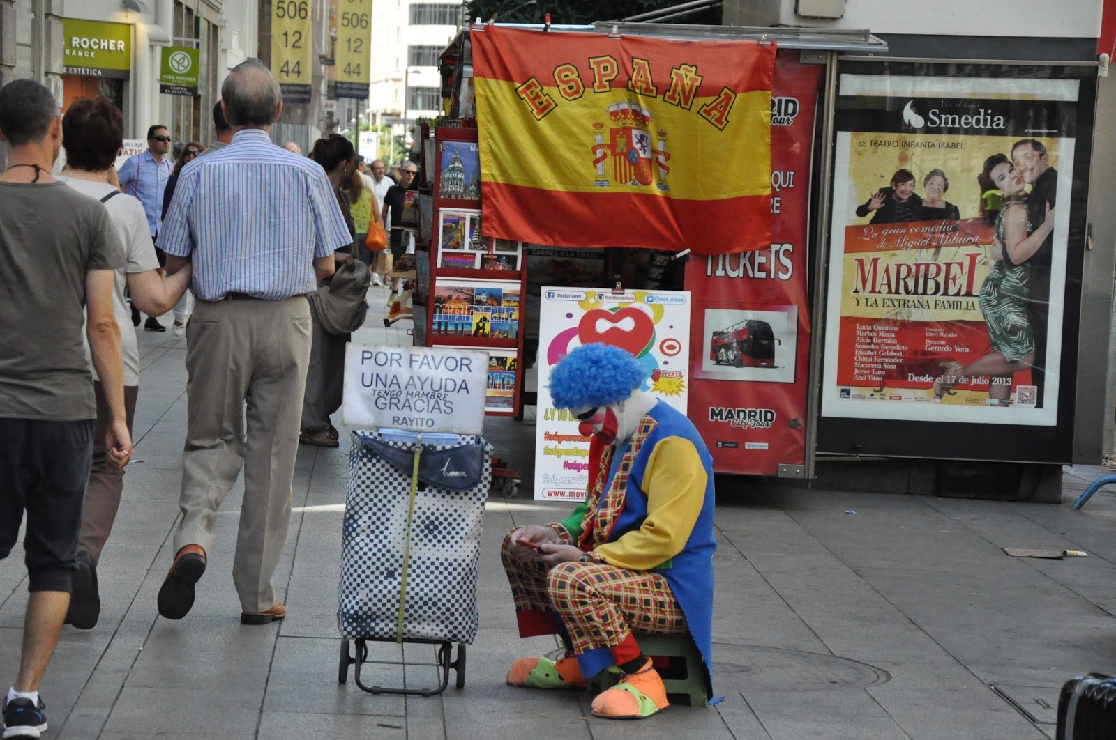 No hay nada como salir a dar una vuelta por el centro de Madrid en una mañana soleada de domingo. La luz de esta ciudad podría hacernos pensar que las colas de clientes en las administraciones de lotería, los turistas sentados en las terrazas de los restaurantes, los madrileños paseando pausadamente por las calles alrededor de Sol o consumiendo en las tiendas y grandes comercios de la zona son el signo de que estamos saliendo de la recesión, que lo que nos dice el gobierno de Rajoy es cierto y estamos dejando la crisis atrás. Es tan bonita esa luz que si te dejas atrapar creerás vivir en un sueño. Pero si te fijas, entre los pies de los transeuntes, aparecen cartelitos escritos a mano donde dicen cosas como busco trabajo y una ayuda para pagar el alquiler, una ayuda para mis estudios o por favor, una ayuda, tengo hambre. Y detrás de esos cartelitos existen personas de carne y hueso que ven cómo los demás paseamos y nos sentamos en las terrazas a tomar unas cervezas. Alguna de ellas al lado justo de nuestra silla, sentada en el suelo, con las piernas escondidas entre la ropa y el cuerpo, la cara agachada, mirando hacia al suelo, mientras levanta una mano cada vez que alguien pasa a su lado. O sentada al lado del cajero donde sacamos dinero o a la puerta de un iglesia o de un supermercado o deslizándose entre las sillas de las terrazas, de mesa en mesa, ante el gesto indiferente y en algún caso despectivo de sus ocupantes. Con la luz están las sombras que se extienden cada vez más, atrapando a personas que jamás hubieran pensado encontrarse en situaciones tan dramáticas. Esas sombras son los números de los telediarios y los silencios de los políticos. Son las que puedes ver a través de las piernas de los risueños caminantes.