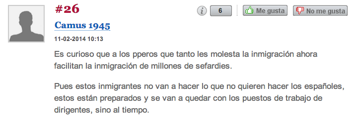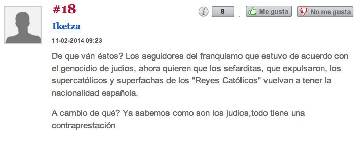 La noticia de que el Consejo de Ministros español aprueba la reforma del Código Civil que posibilita la doble nacionalidad de millones de sefardíes, a falta de la ratificación por parte del Congreso y del Senado, es una excusa para que aparezca el antisemitismo español, como se puede comprobar en alguno de los comentarios de los lectores.