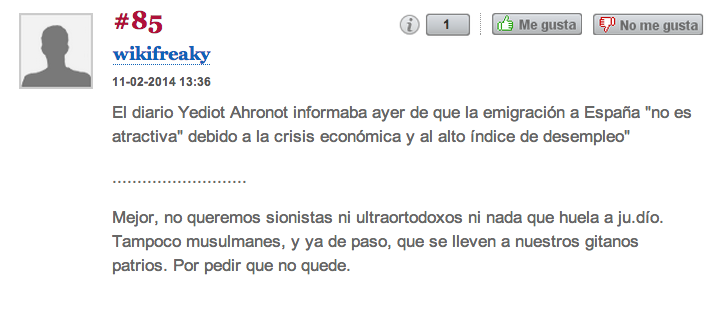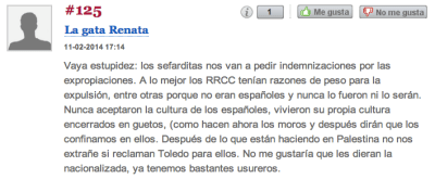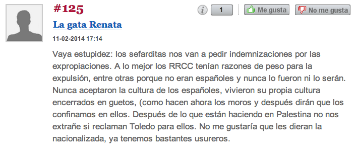 Algunos de los comentarios de la noticia, que hace referencia a esta posibilidad, son una colección de estereotipos y de ignorancia. Desde los que mezclan sionista con judío, como si todos los judíos fueran sionistas, hasta los que alertan del volumen de inmigración que sufrirá el estado, como si nada más conseguir la nacionalidad se van a venir a vivir aquí. No faltan los que echan mano de uno de los estereotipos más manoseados: usureros. Los que mezclan el tema de Palestina o los que hablan de otras reparaciones (moriscos, saharauis o los asesinados durante la Guerra Civil y el fascismo español), como excusa para criticar la decisión.