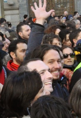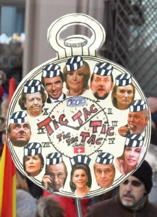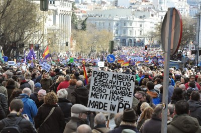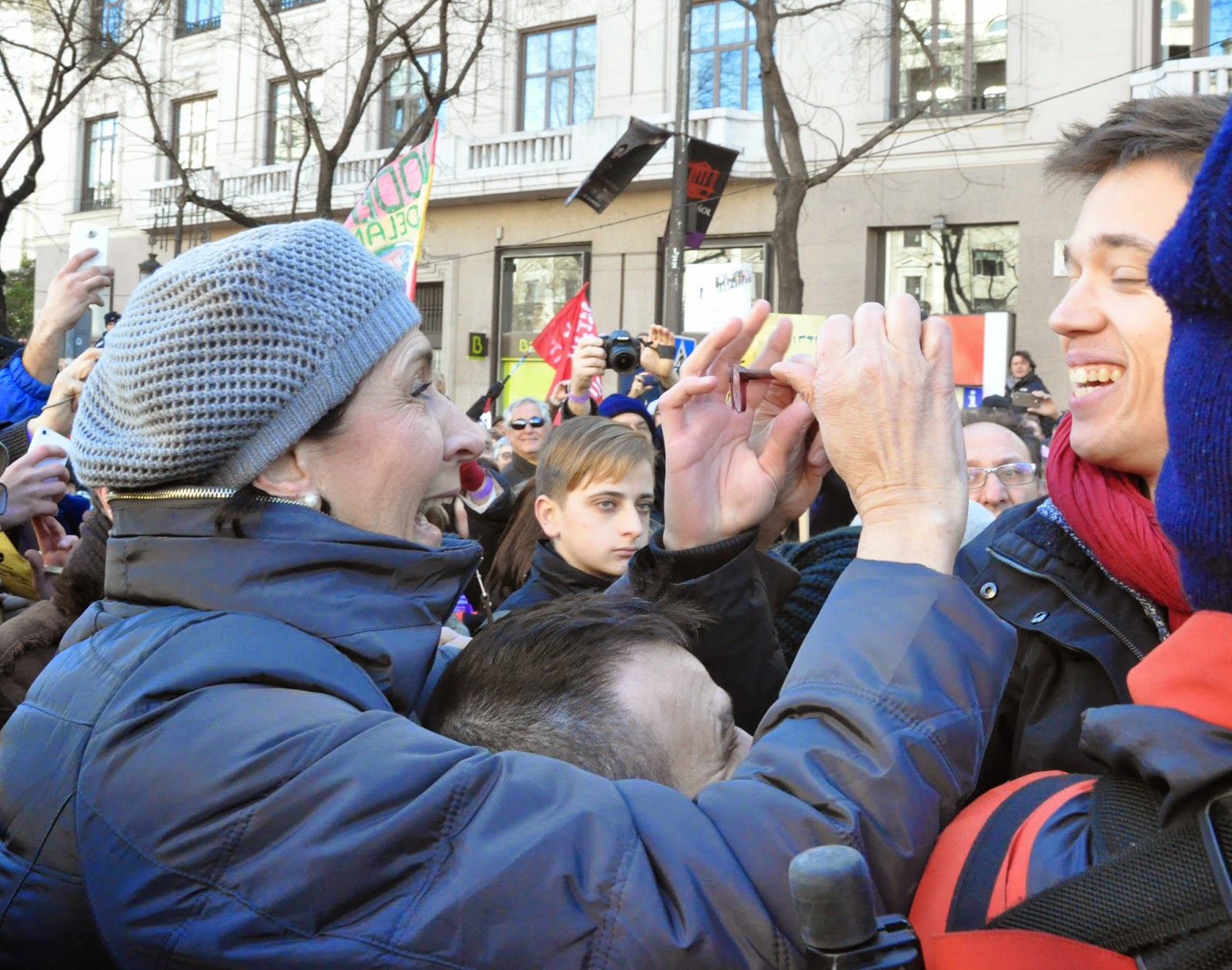 La manifestación ha sido multitudinaria. No creo que sea tan importante si han sido 100.000 o 500.000. Lo que es evidente es que Podemos quería una muestra del apoyo de la ciudadanía a su proyecto y la han recibido con creces. La Puerta del Sol estaba abarrotada y parte de las calles adyacentes, especialmente la calle de Alcalá, también. No había muchas pancartas con lemas en comparación con otras convocatorias lo cual es coherente con la ausencia de una reivindicación política concreta. Allí se estaba para expresar el apoyo a Podemos y, especialmente, a sus caras más visibles, empezando por Pablo Iglesias. La llegada de Errejón a la cabecera, poco antes del comienzo de la manifestación, fue caótica con decenas de participantes y periodistas agolpándose a su alrededor, empujándose entre sí, chocando las cámaras de fotos, buscando una instantánea del miembro, probablemente, más brillante del nuevo partido. Las gafas de Errejón salieron volando por la lucha por el espacio de los que le rodeaban, la lucha por situarse lo más cerca posible de la estrella.