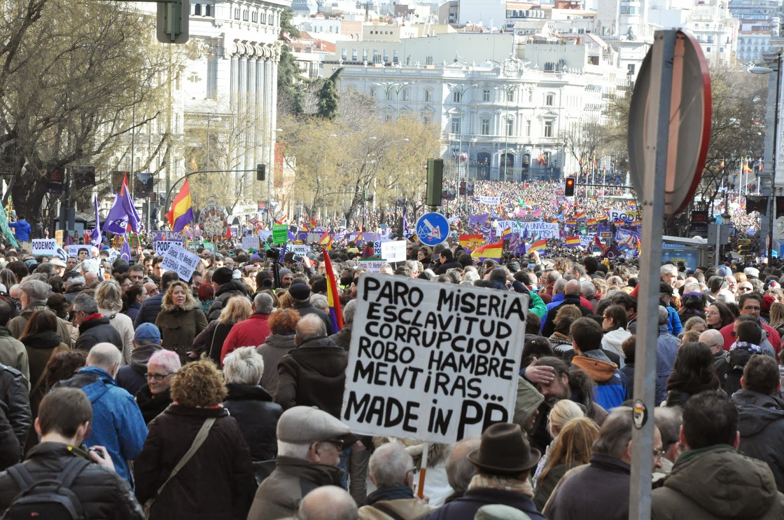 La marcha del cambio. Aún está por saber en qué consistirá este cambio pero la convocatoria de Podemos ha sido suficiente para que cientos de personas se apunten. La ilusión era algo que casi se podía tocar en la manifestación que ha recorrido Madrid desde Cibeles hasta la Puerta del Sol. No me ha contagiado porque estoy un poco curado de espanto y no es la primera vez que percibo esa misma ilusión pero lo que no se puede negar es que Podemos ha sido capaz de volver a hacer creer que puede haber un cambio. Y es un mérito digno de reconocer porque no hay ni una sola de las restantes fuerzas políticas capaz de transmitir la esperanza de construir otra sociedad. Aunque a muchos de los participantes no les parecía incomodar que Podemos no sea capaz de definir claramente qué tipo de sociedad quiere, más allá de la lucha contra la corrupción y la dignificación de la política. El vacío es cubierto por las esperanzas de cada uno de los participantes.