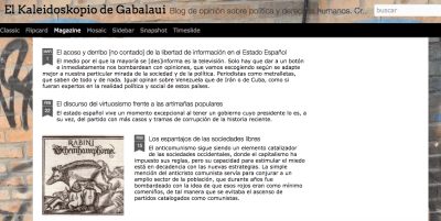 Blog de opinión sobre política y derechos humanos. Creado en el año 2009 como un blog de recopilación de artículos, que permitieran ofrecer otras miradas sobre lo que sucedía en el mundo diferentes a las que ofrecen los medios generalistas, se fue transformando en estos años en una bitácora de opinión política desde la perspectiva del autor. De las miradas de otros a la mirada kaleidoskópica de Gabalaui. Sed bienvenidos.