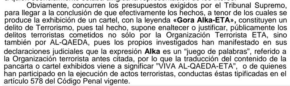 Este razonamiento es demencial pero ampliamente compartido por gran parte de los ciudadanos aunque la banda armada anunciara en el año 2011 el cese definitivo de su actividad armada. Los padres asistentes a la función de la Compañía de Títeres desde Abajo se escandalizaron cuando vieron una pancarta que decía Gora Alka-ETA. Una madre incluso mencionó que hablaron en euskera. Además hubo una violación, se mató a una monja y se ahorcó a un juez. Ya está. Delito de enaltecimiento del terrorismo. Sin más. Es suficiente la opinión de unos padres sobre el contenido de una obra artística y una pancarta para que unos artistas granaínos que venían a representar su obra en Madrid, dentro de la programación municipal de carnavales, fueran detenidos por la policía, puestos a disposición judicial y enviados a prisión por el delito de enaltecimiento del terrorismo y otro delito cometido con ocasión del ejercicio de derechos fundamentales y de las libertades públicas garantizados por la Constitución. Así ha funcionado la justicia durante décadas en este Estado: