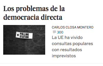 Considerar el referéndum del Reino Unido como un ejemplo de democracia directa suena a broma. Aún así el periódico El País, cuya linea editorial es partidaria de la democracia representativa, no ha dudado en retitular el artículo La Europa Plesbicitaria de Carlos Closa Montero como Los Problemas de la democracia directa. Closa, a su vez, alude al referéndum británico para decir que parece que algunos han descubierto que la alabada democracia directa quizás no sea tan buena idea después de todo para, posteriormente, hacer un recorrido por los diferentes referéndums que se han convocado en los últimos años en Europa. La alusión a la democracia directa solo aparece en el primer párrafo y después centra su análisis en la utilización de los referéndums en el contexto de las democracias representativas europeas y los intereses particulares de los convocantes. Es decir, nada de esto tiene que ver con la alabada democracia directa que, por otra parte, está muy lejos de ser alabada. Los medios de comunicación partidarios del actual sistema no dejan pasar la oportunidad de desacreditarla a la mínima ocasión aunque lo que critiquen no tenga que ver con ella sino con el actual funcionamiento de la democracia representativa y de los gobiernos y partidos que la sostienen.